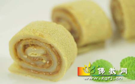 4、将调好的馅料均匀涂抹在糯米皮上,卷起来;