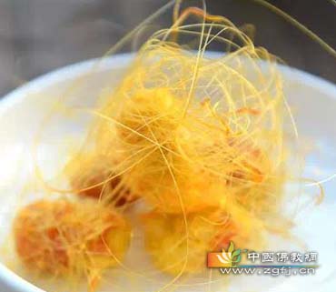 8、将炸好的红薯蘸上糖稀,右手用铲子舀起糖稀,糖稀滴落的过程拉细丝,将红薯反复缠绕即可,缠完后将牙签脱出;