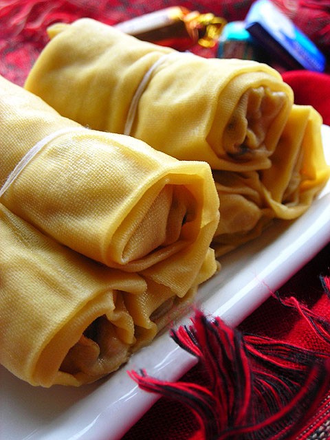 材料:素肉馅、千张、冬笋、芝麻、姜。