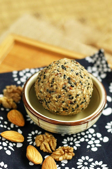 原料:大杏仁50克、核桃仁50克、黑芝麻30克、瓜子仁70克、白砂糖90克、面粉55克