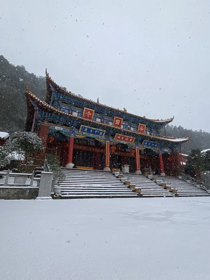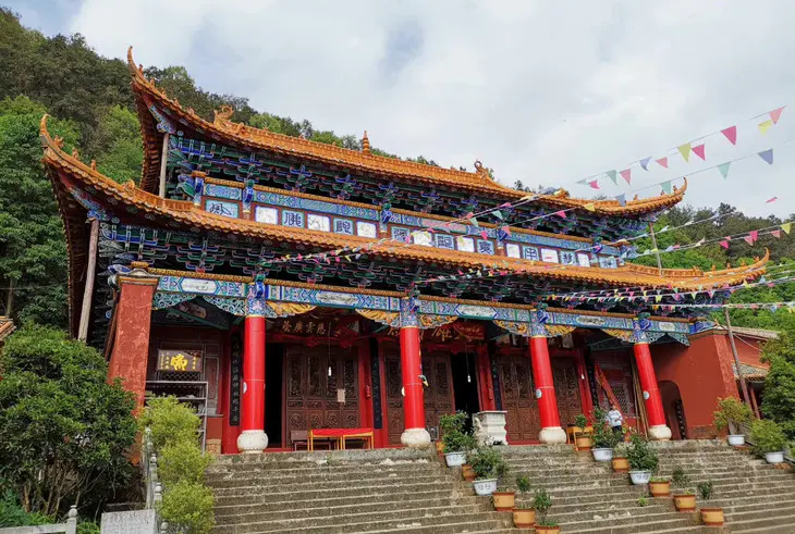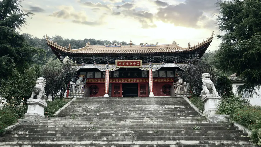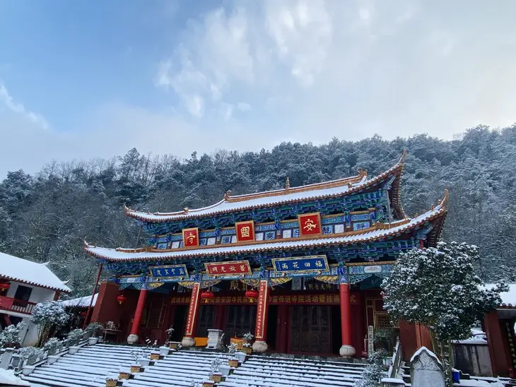 佛寺建成之后,唐玄宗李隆基亲题了“安国寺”三字作为寺名,落款“天宝十二年御题”。而唐代皇帝的墨迹,在云南几乎没有,独滇中的“安国寺”寺名却得唐玄宗御笔。这极有利于唐王朝对南诏原爨地人民的思想文化统治和巩固安定团结的社会局面,逐渐改变原爨氏的信仰习俗,意在从此国家安定,民族兴旺,遂悬御匾于寺门正上端。至南诏大理国后,有元代玄鉴无照国师,在安国寺驻锡三年讲经复建寺院,续演临济宗朗目派法脉,再现安国辉煌,后应梁王之请入昆明建西山太华寺,所以两寺院在建筑风格上有很多相似之处。