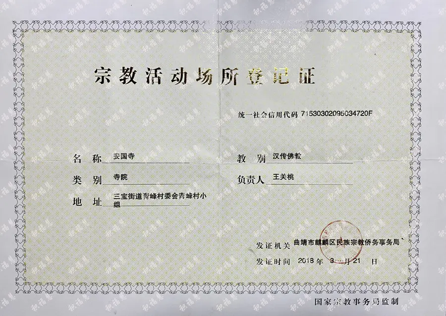 云南安国寺始建于唐天宝十年(公元751年),至今已有1270年历史,是曲靖地区最古老的寺庙之一,为曲靖市重要的佛教圣地。唐天宝年间,受唐王朝扶持的南诏王阁罗凤举兵灭爨崇道后,随着南诏政权的建立,一度时期,这里出现了“南蛮东夷,咸来稽歌,四海无事,万里郭清”的安定局面。为了有利于政治文化的统一,巩固这一民族地区得来不易的安定团结。在原爨氏统治的中心南宁故城西南真峰山择宝地建盖佛寺。这是目前有记载的这一地区最早建盖的佛寺。
