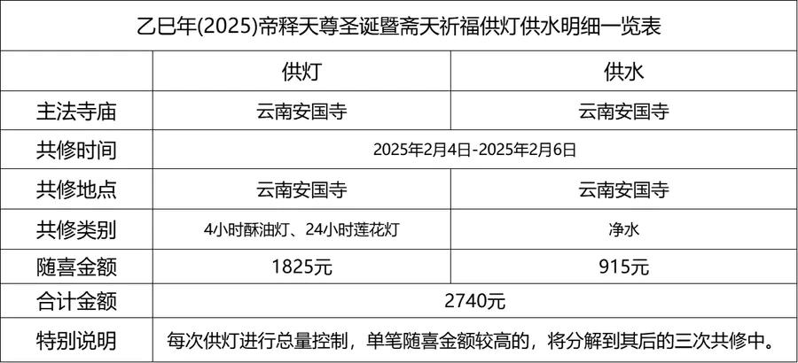 积福慧乙巳年(2025)帝释天尊圣诞暨斋天祈福供灯供水共修自2025年2月4日启建,至2025年2月6日23时停止接收功德款,共计3天。