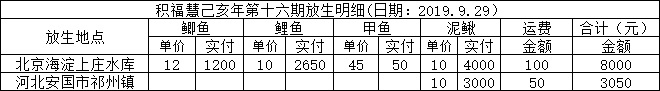 2019年9月29日,积福慧在北京市海淀区上庄水库和河北省安国市祁州镇南七公村分别举行放生法会。由法师引领,五十余位同修共同参与,放生鲫鱼120斤、放生鲤鱼265斤、放生泥鳅共700斤、甲鱼1只。