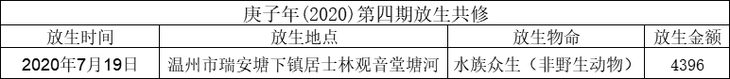 应大众所请,随顺时节因缘,积福慧、佛教导航与江浙佛教联合启建庚子年第四期放生共修。共修自2020年7月14日始,至2020年7月18日24时止,共计5天。2020年7月19日,积福慧在温州市瑞安塘下镇居士林观音堂塘河举行放生法会,放生各类水族众生金额合计4396元。