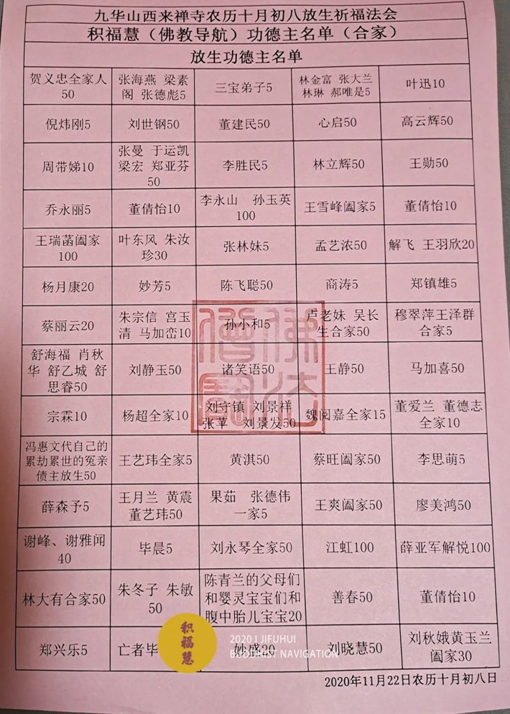 应大众所请,积福慧、佛教导航与江浙佛教联合九华山道场启建庚子年第十一期放生共修。共修自2020年11月20日始,至2020年11月21日24时止,共计2天。2020年11月22日,积福慧在安徽池州青阳向阳水库晚坑口和温州瑞安塘下镇罗凤片区塘河举行放生法会,放生泥鳅、鲤鱼、鲫鱼等众生(非野生动物)金额合计6380元。