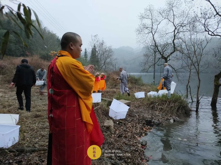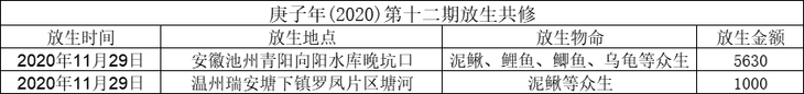 应大众所请,积福慧、佛教导航与江浙佛教联合九华山道场启建庚子年第十二期放生共修。共修自2020年11月27日始,至2020年11月28日24时止,共计2天。2020年11月29日,积福慧在安徽省池州市青阳县向阳水库晚坑口和温州市瑞安塘下镇罗凤片区塘河举行放生法会,放生泥鳅、鲤鱼、鲫鱼、乌龟等众生(非野生动物)金额合计6630元。