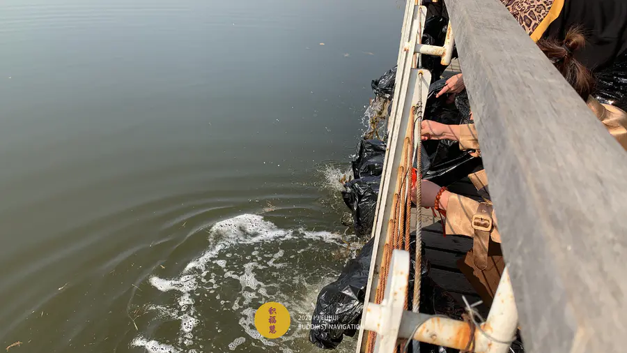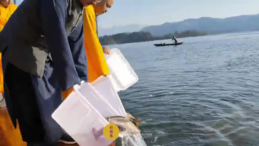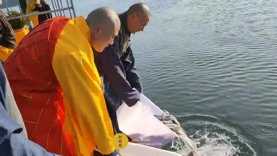 放生由法师主法。按照放生仪轨,为放生水族物命诵大悲咒、洒净。加持众等今生报尽,永不再沦入三恶道中,种下佛种,了知生灭之法,脱离恶道,生于善道。