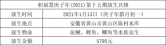 应大众所请,积福慧、佛教导航与江浙佛教联合九华山道场启建庚子年第十五期放生共修。共修自2020年12月29日始,至2021年1月12日24时止,共计15天。