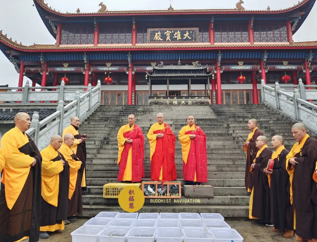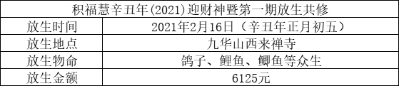 值此殊胜因缘,应大众所请,积福慧、佛教导航与江浙佛教联合九华山道场启建辛丑年迎财神暨第一期放生供水共修。共修自2021年2月13日始,至2021年2月16日24时止,共计4天。迎财神当天,积福慧在九华山道场、积福慧灯院分别启建放生、供水共修。放生鸽子、鲤鱼、鲫鱼等众生(非野生动物)金额合计6125元。供水金额合计5075元。