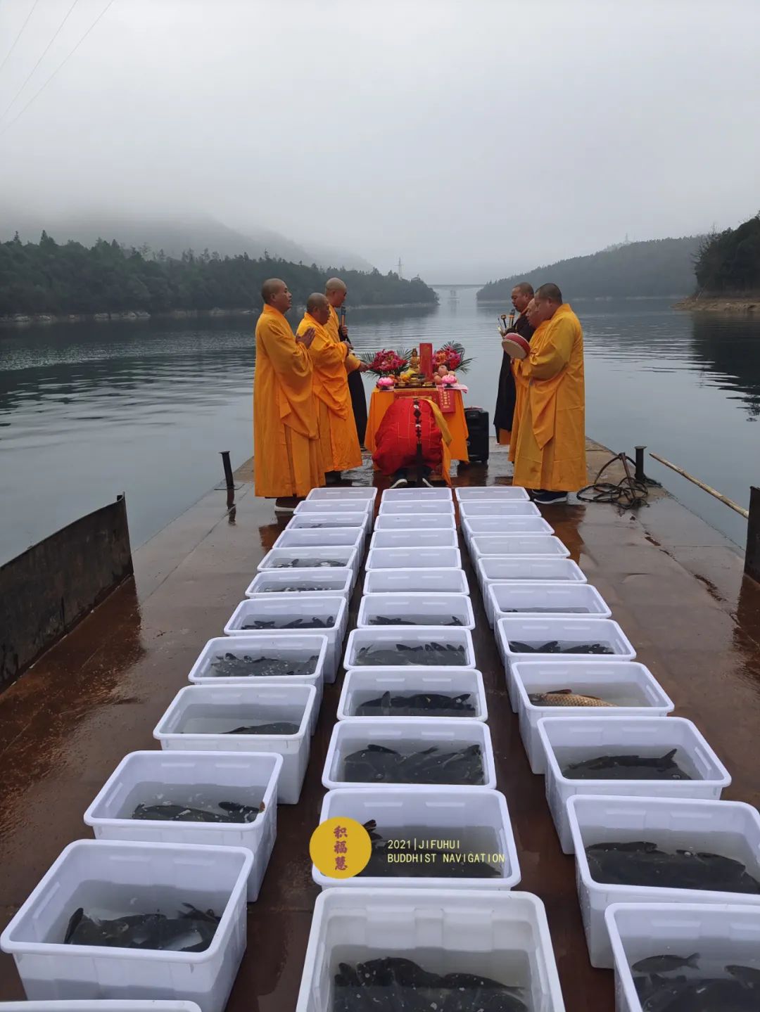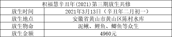 应大众所请,积福慧、佛教导航与江浙佛教联合九华山道场启建辛丑年第三期放生共修。共修自2021年3月9日始,至2021年3月12日24时止,共计4天。2021年3月13日当天,积福慧在安徽省黄山市黄山区陈村水库举行放生法会,放生泥鳅、鲤鱼、鲫鱼等众生(非野生动物)金额合计4960元。