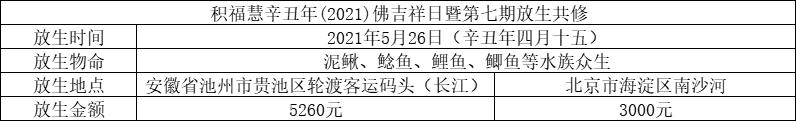 值此因缘,应大众所请,积福慧、佛教导航与江浙佛教联合九华山道场启建辛丑年佛吉祥日暨第七期放生共修。共修自2021年5月21日始,至2021年5月25日24时止,共计5天。2021年5月26日,积福慧在北京市海淀区南沙河、安徽省池州市贵池区轮渡客运码头(长江)举行放生法会,放生泥鳅、鲶鱼、鲤鱼、鲫鱼等众生(非野生动物)金额合计8260元。