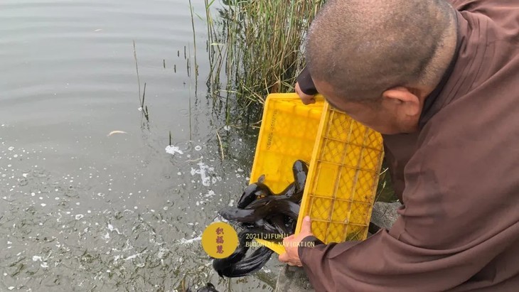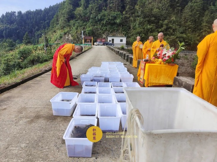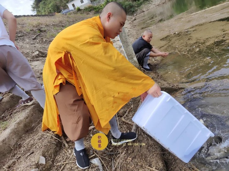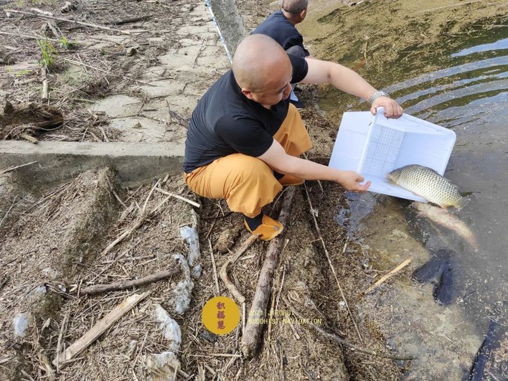 法师们将待放生的水族众生搬运至岸边