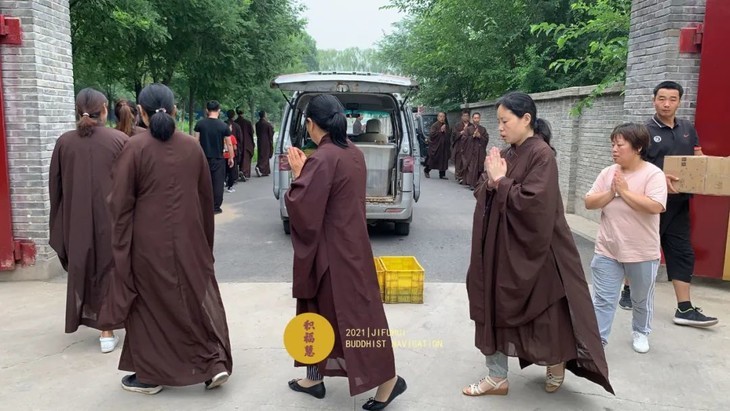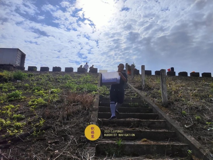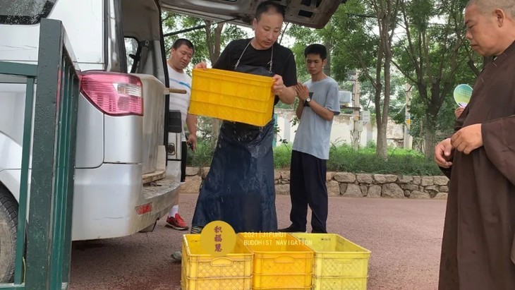 居士们将放生物搬至岸边准备放生