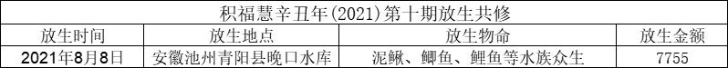 积福慧以此辛丑年第十期放生共修回向众等悉皆具足世出世间一切顺缘和安乐,速圆菩提心,精勤菩提行,救护无边众,同生涅槃法。