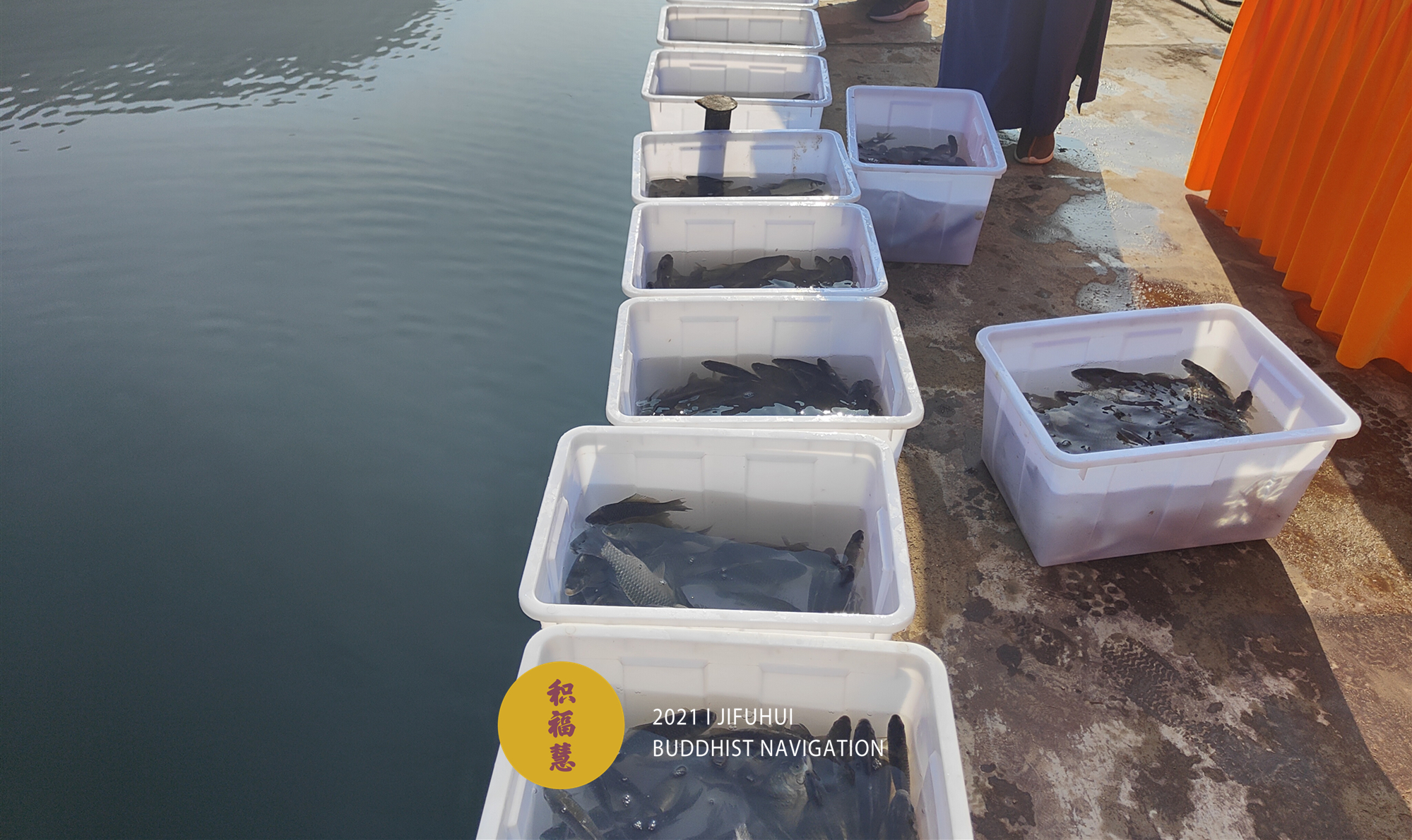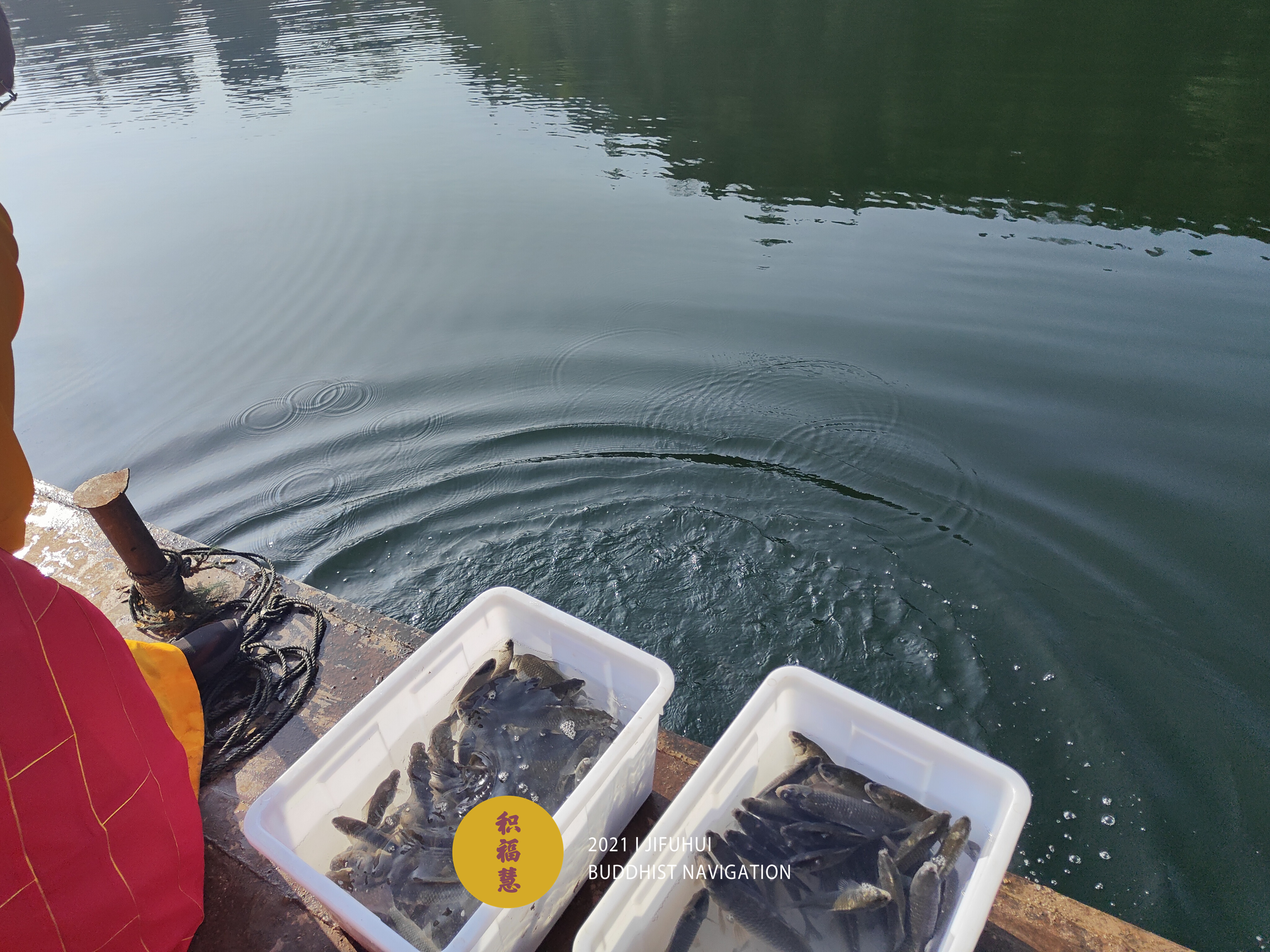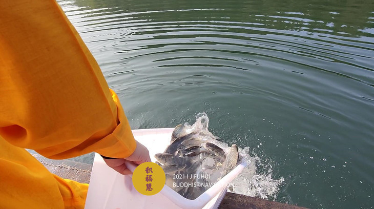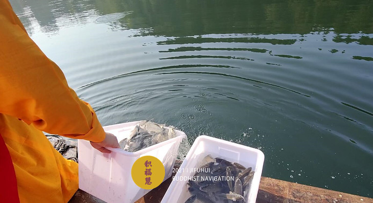 放生仪轨圆满。将泥鳅、鲤鱼、鲫鱼等水族众生搬到船边,开始放生。