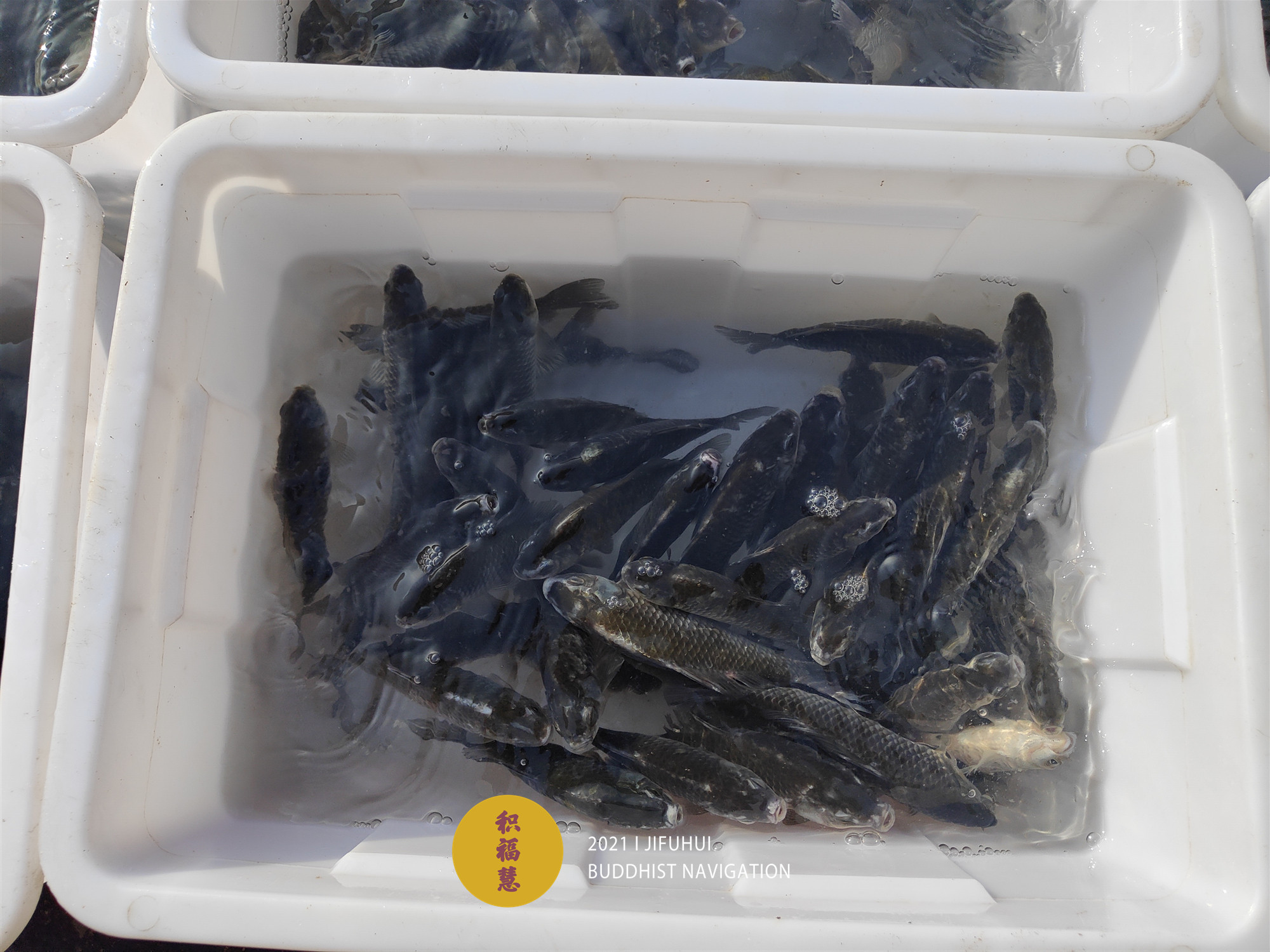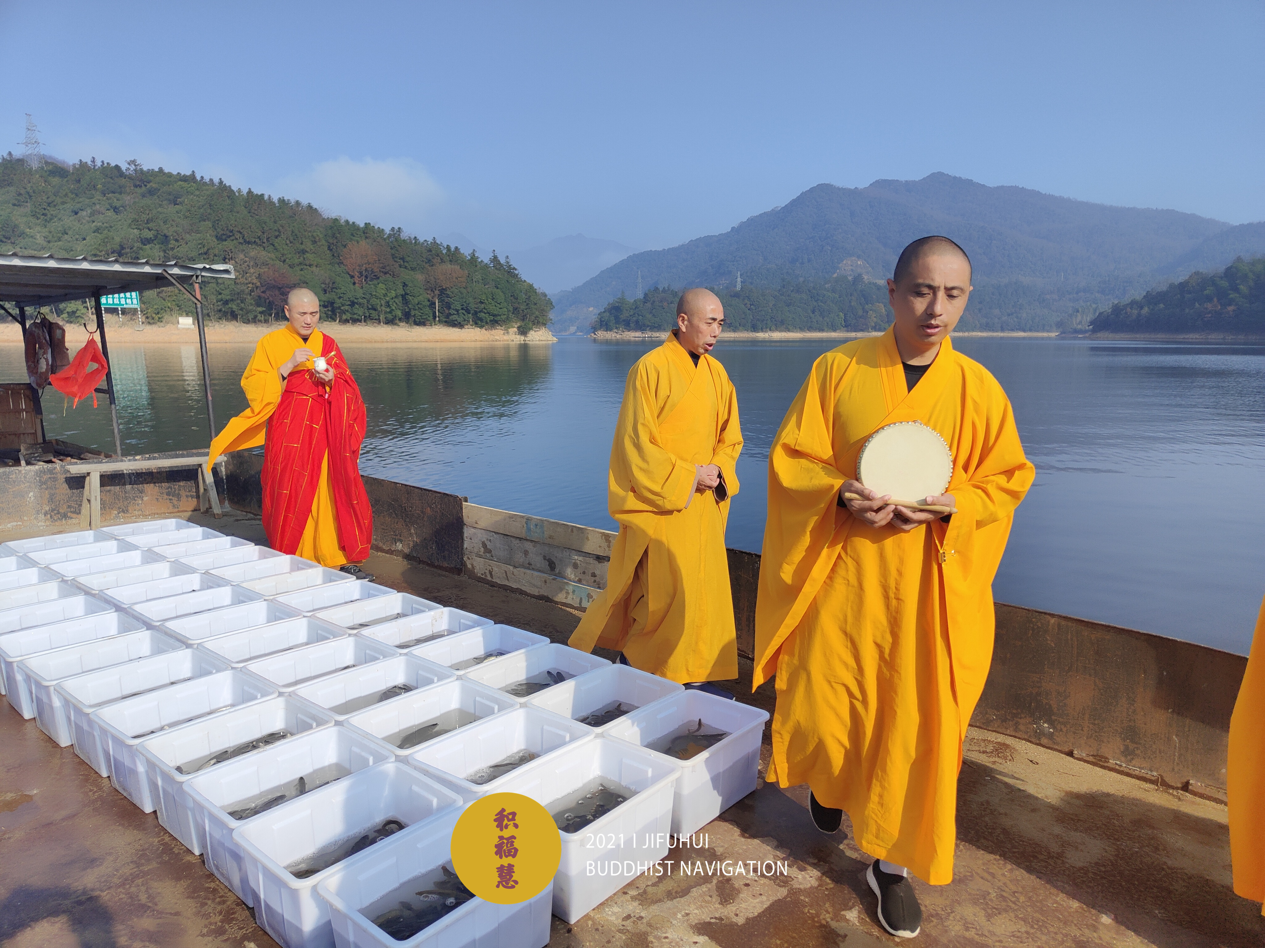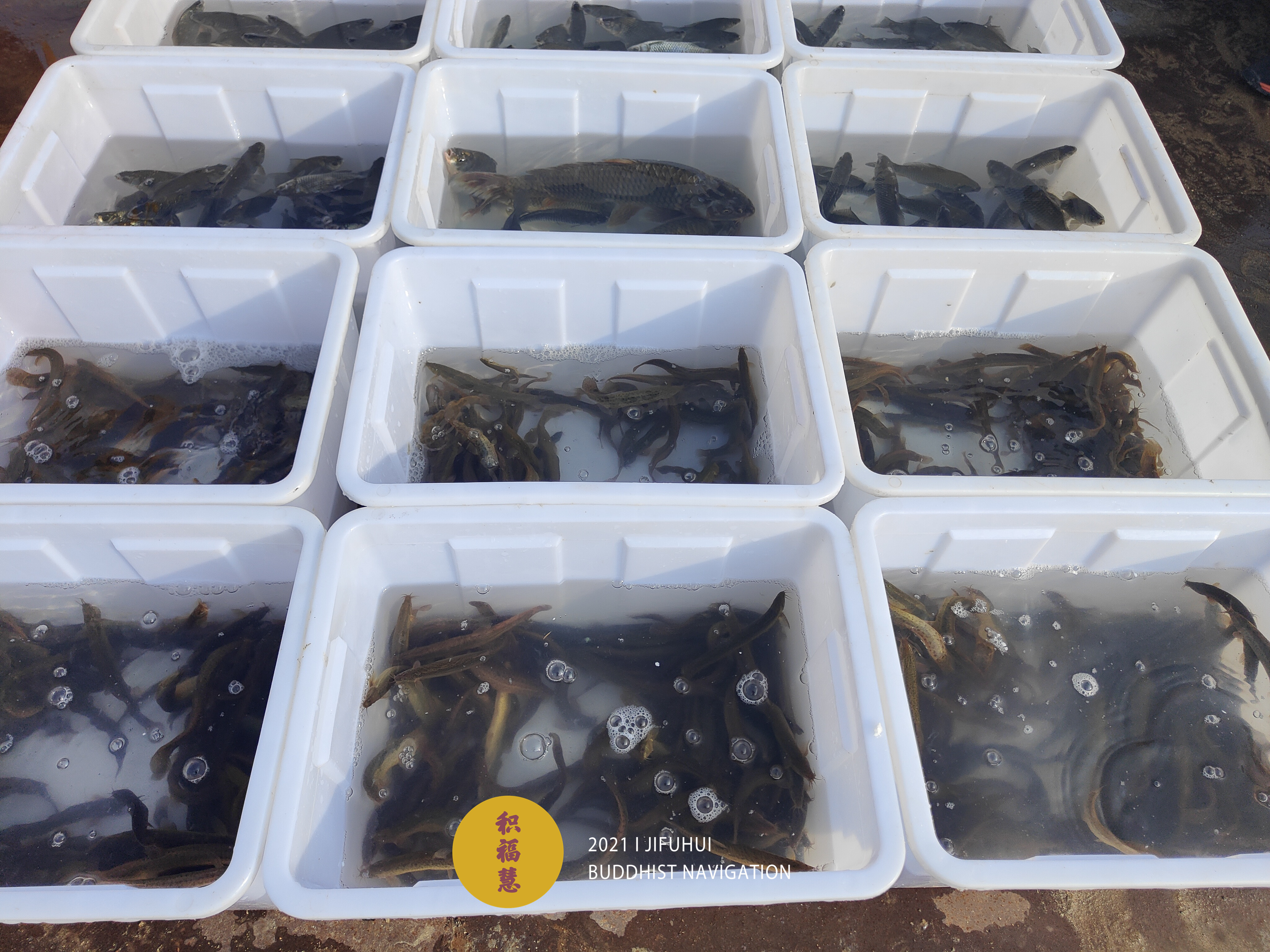 放生仪轨圆满。将泥鳅、鲤鱼、鲫鱼等水族众生搬到船边,开始放生。