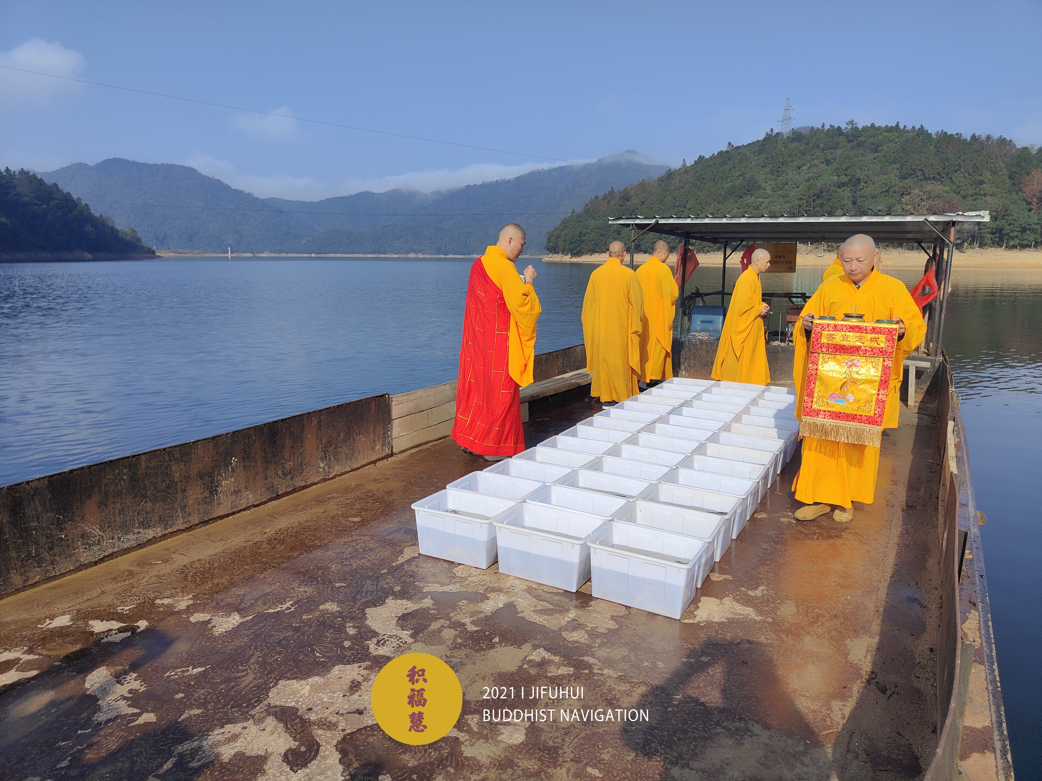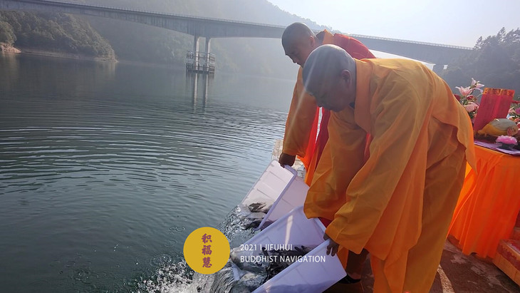 为避免物命在放生过程中受到二次伤害,法师们专门租用拖船,载着放生物行至湖中。