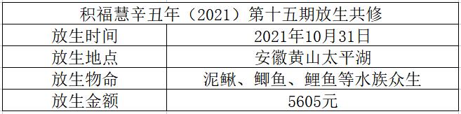 积福慧以此辛丑年第十五期放生共修功德回向众等罪业消除,解冤释结,诸事顺利,吉祥安康,所修善根,日益增长。命终之际,身心安稳,正念分明,得生善处,精进修行,早成正果。