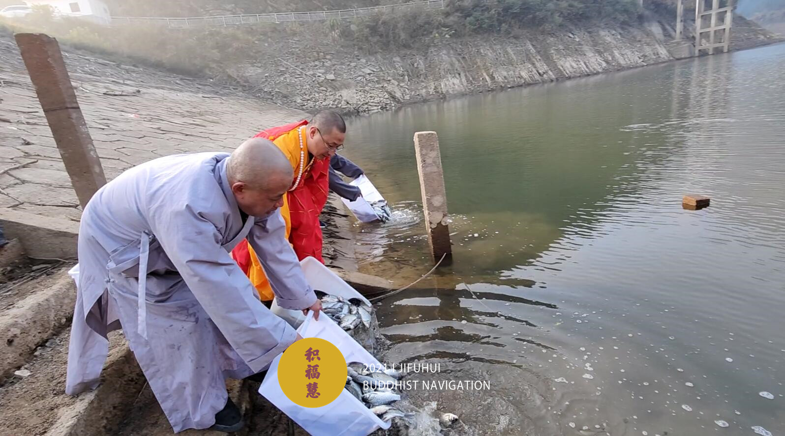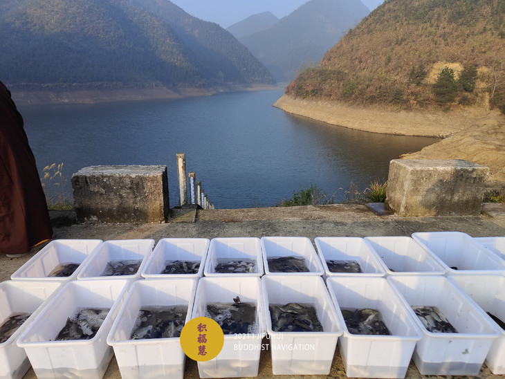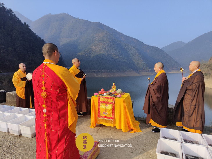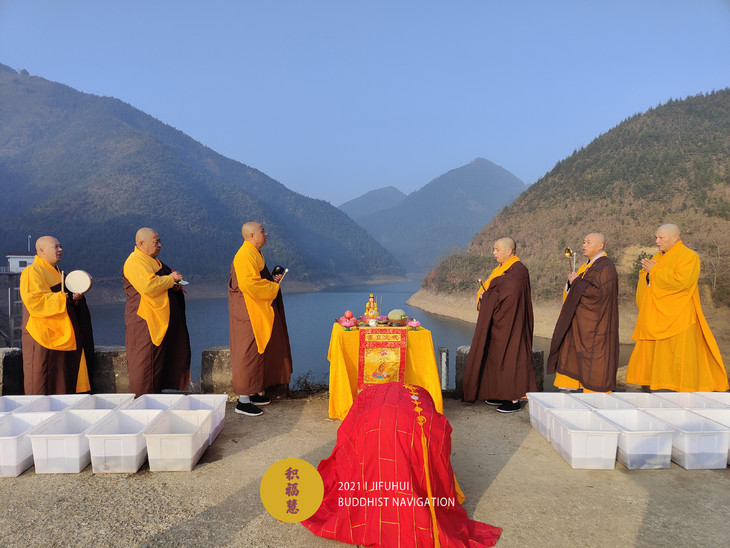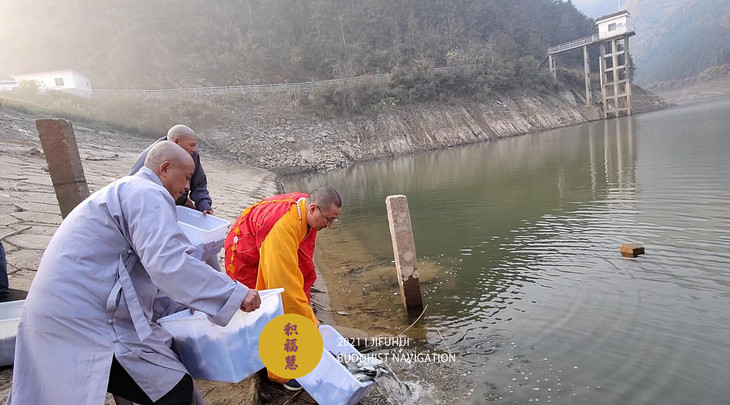 放生仪轨圆满。法师们将水族众生搬到水边。在声声佛号中,众法师一一将物命放生于水库中,令其重获自由,回到大自然的怀抱。