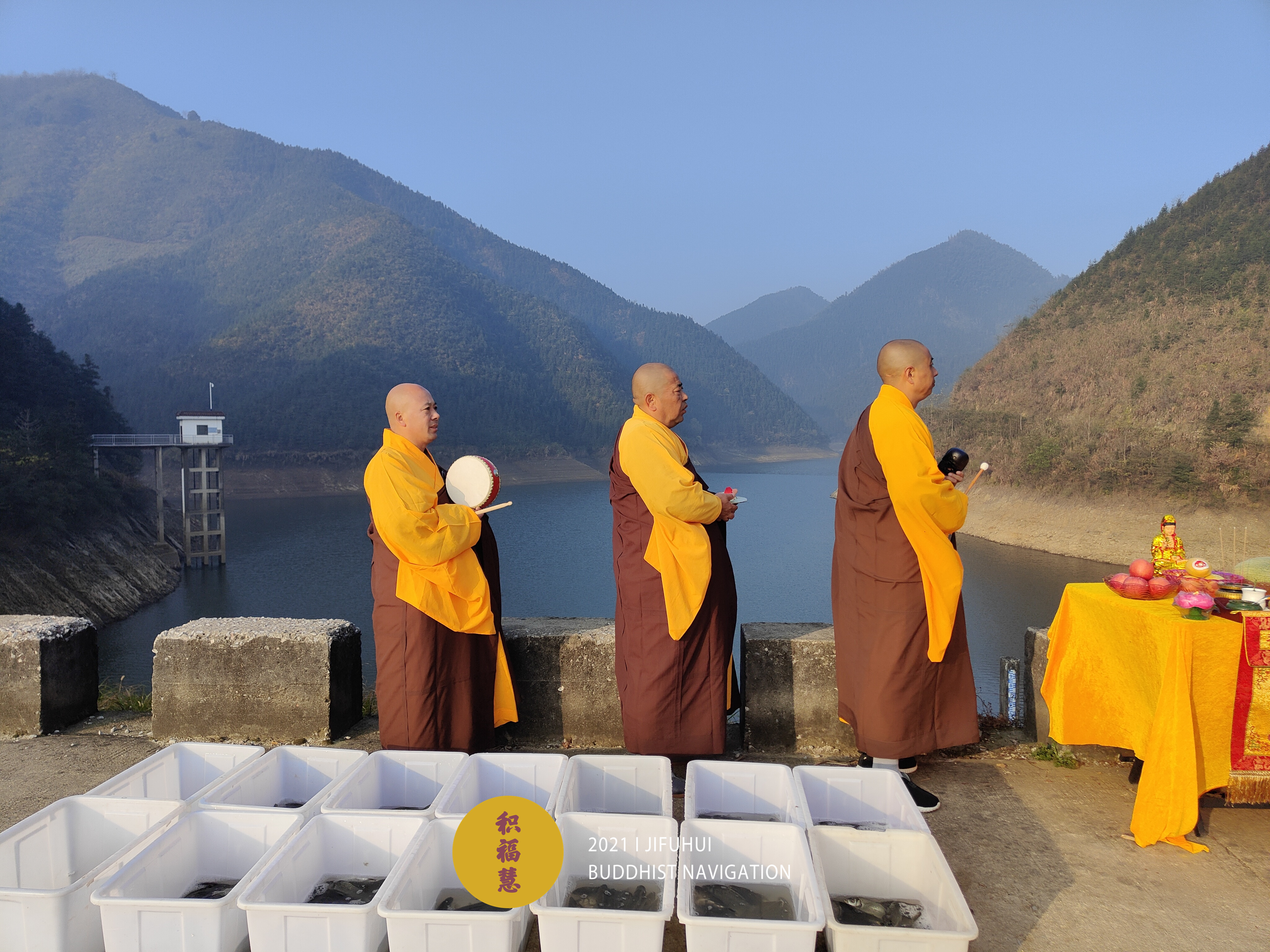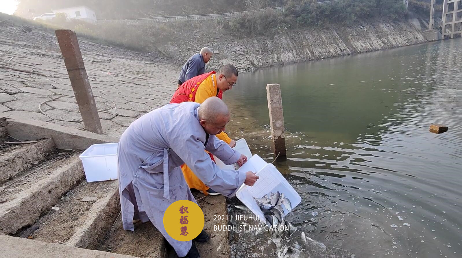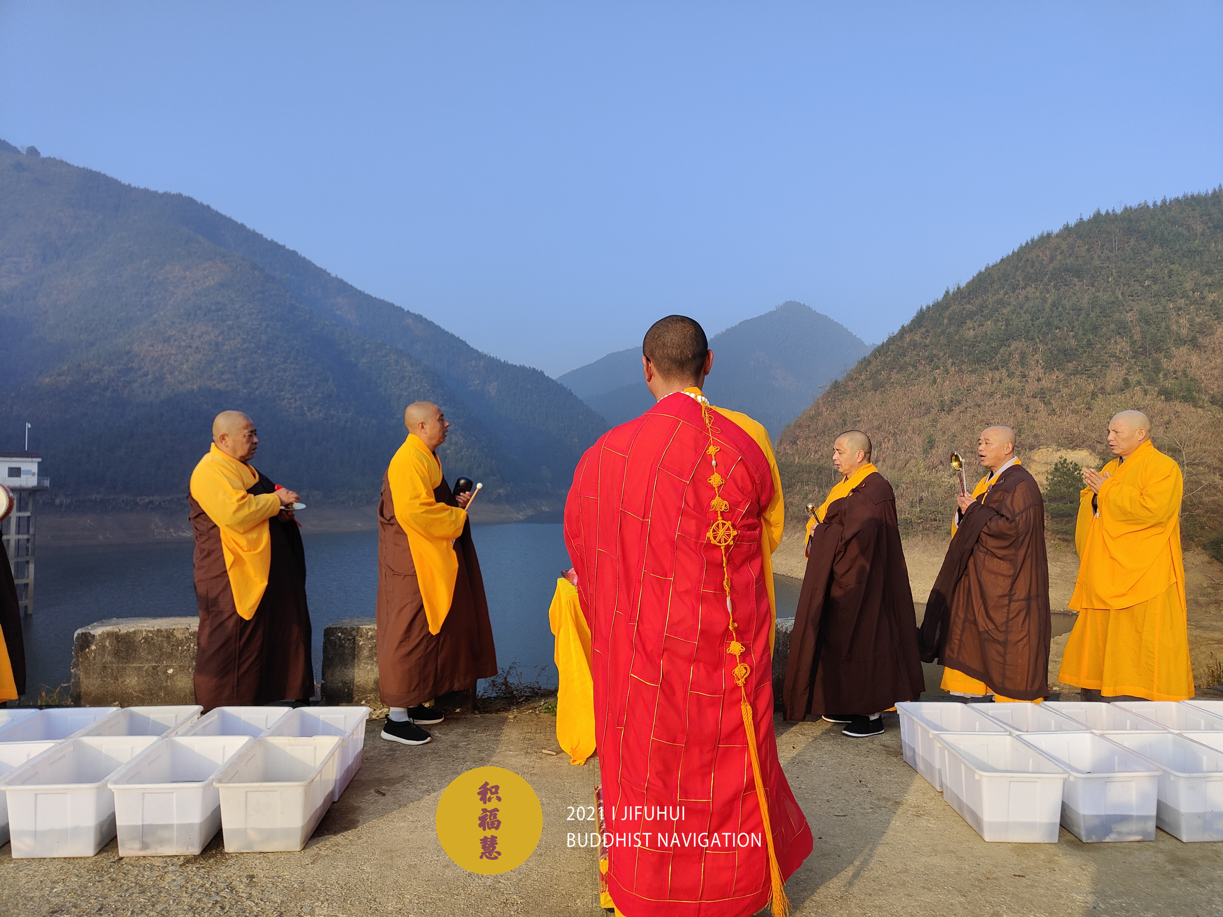 放生仪轨圆满。法师们将水族众生搬到水边。在声声佛号中,众法师一一将物命放生于水库中,令其重获自由,回到大自然的怀抱。