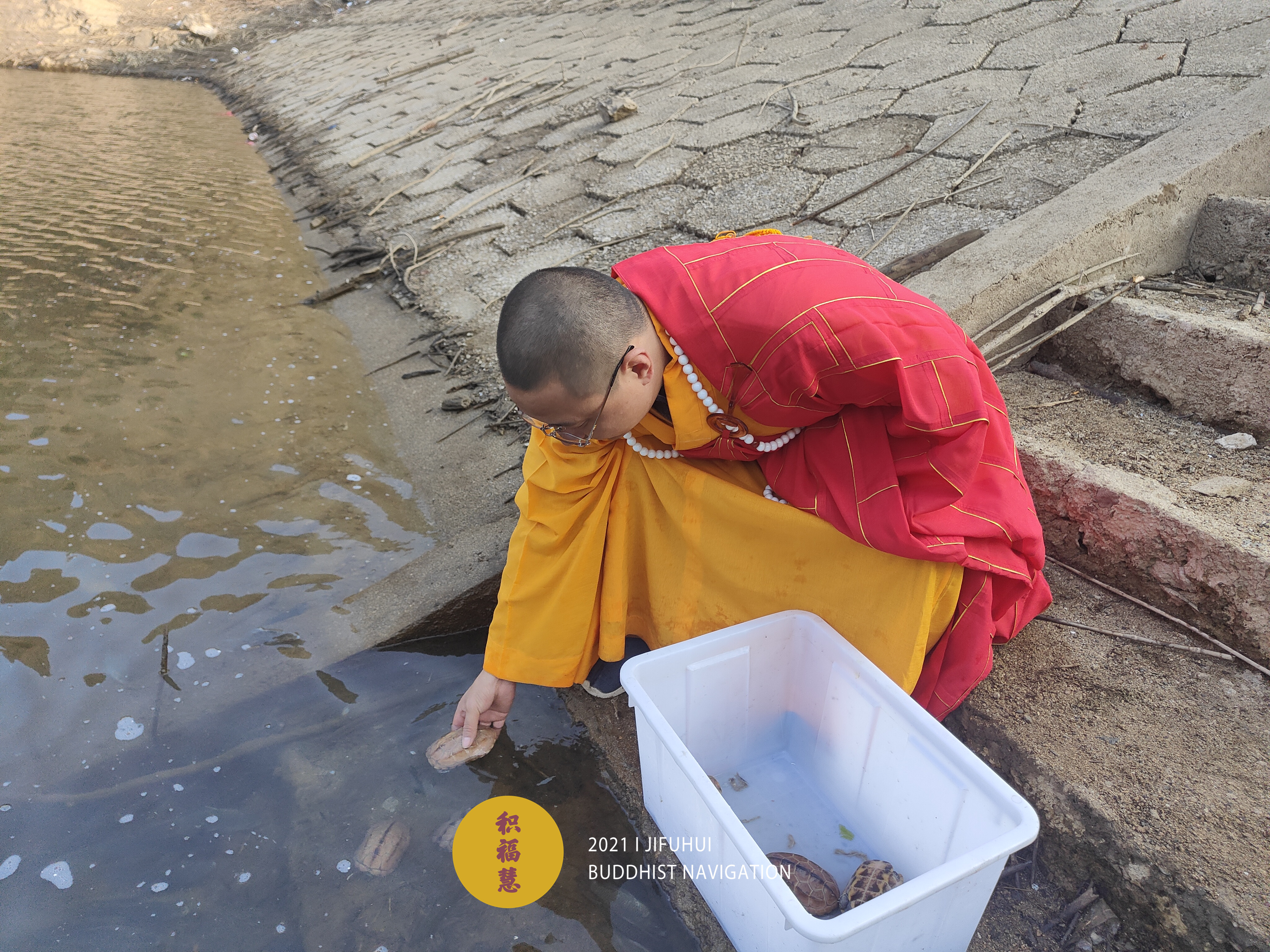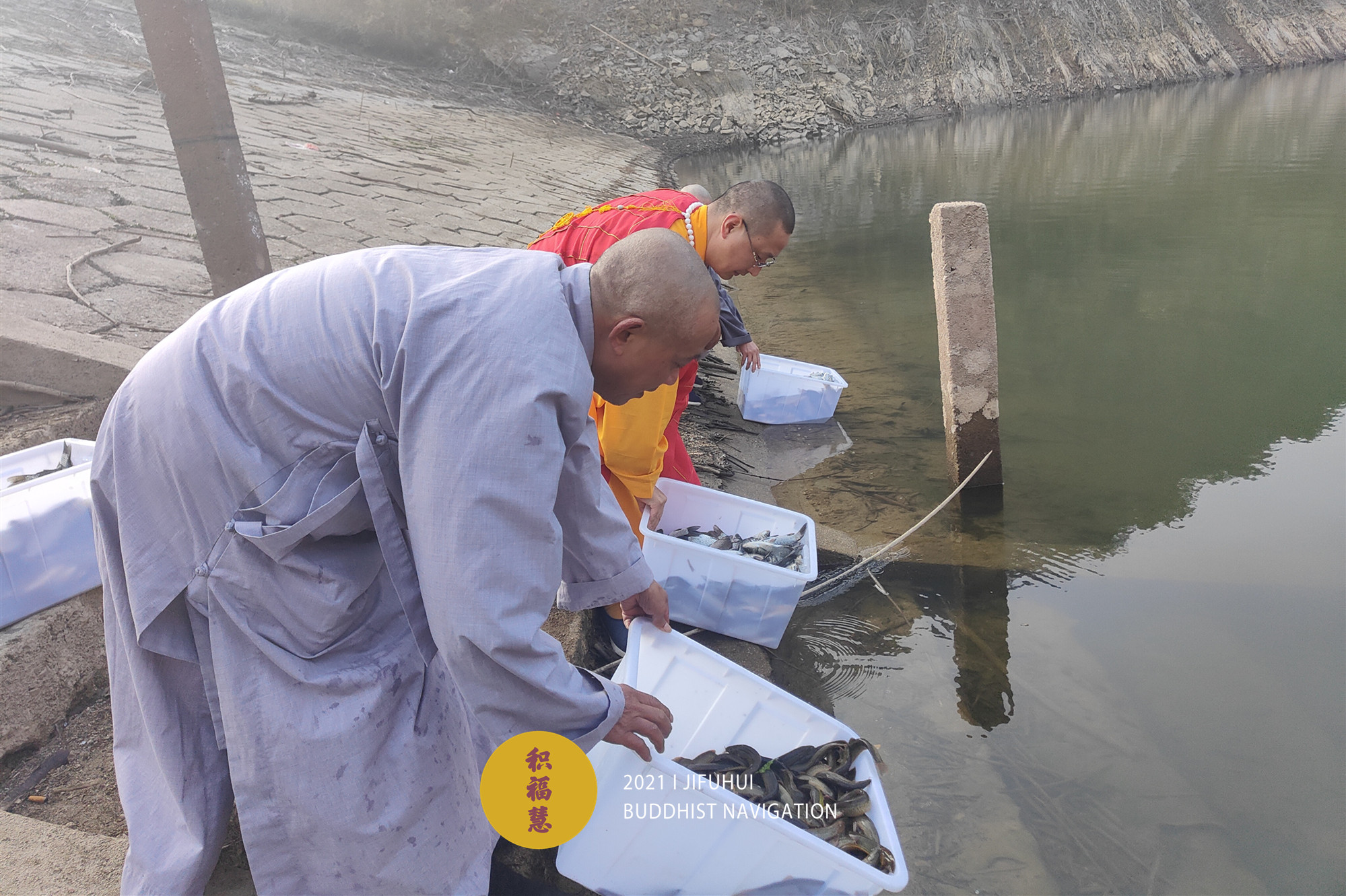 放生开始前,待解救的水族众生被分装到塑料箱中,整齐摆放在岸边。