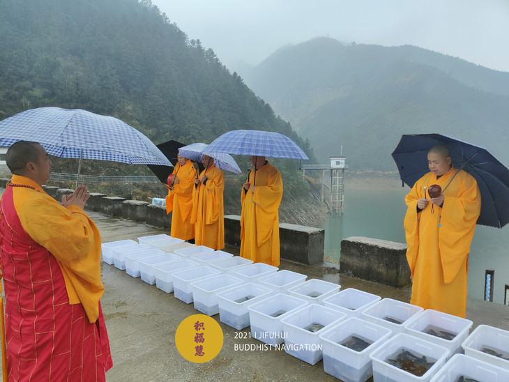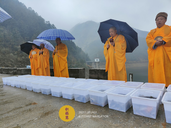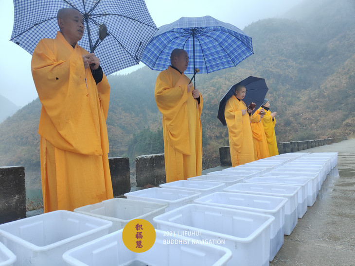 放生物被整齐摆放在水库岸边,法师们在蒙蒙细雨中开始此次放生。
