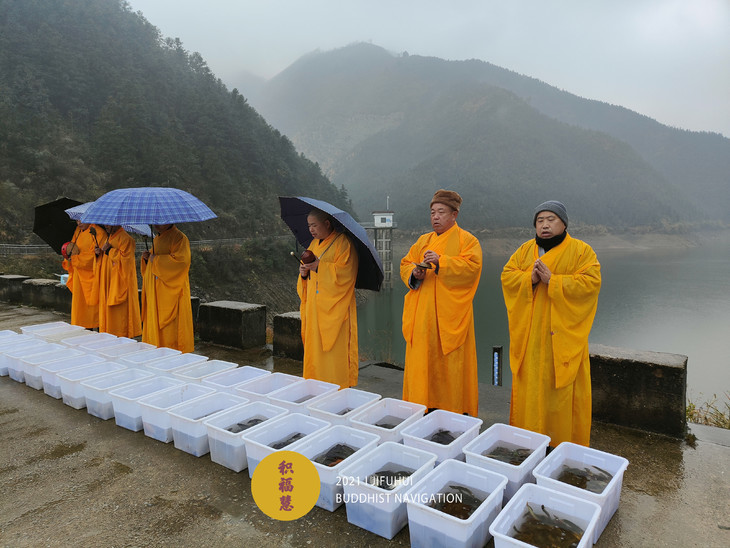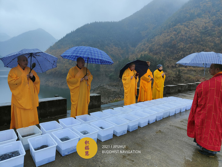 法师潜心诵持梵呗经咒,皈依仪轨,为放生物命种解脱善根,培植福德善缘。