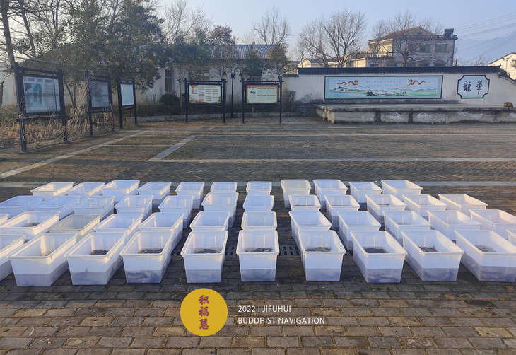 为避免缺氧,此次放生的物命被分装在40多个塑料箱中。
