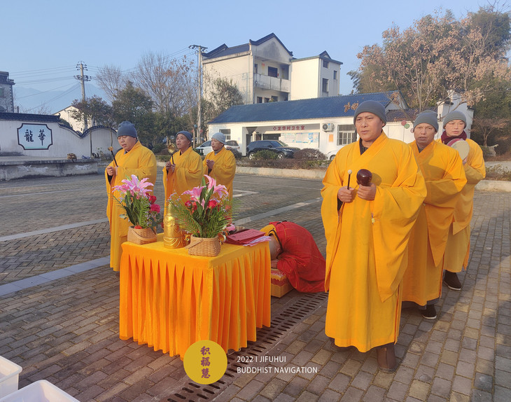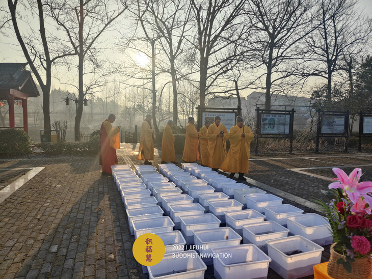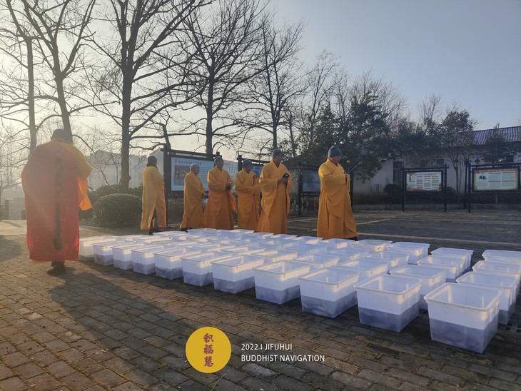 放生仪轨结束。诸位法师搬运放生物命至河边。