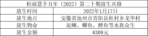 积福慧以此辛丑年第二十期放生共修回向众等诸根完具,疾病消除,解脱厄难,吉祥安康。一切展转皆起慈心,利益安乐,无损恼意及嫌恨心,各各欢悦,互为饶益。解脱一切生老病死,忧愁苦恼。渐次修行诸菩萨行,速得圆满。