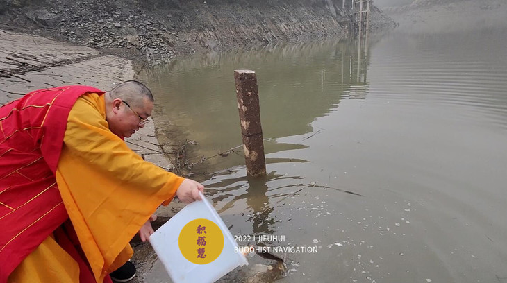 主法法师以大悲净水,为水族生灵净洒甘露,说法加持,为其培植善根、福德资粮。