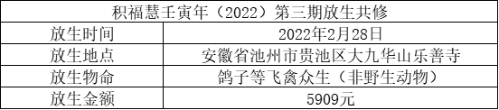 积福慧以此壬寅年第三期放生共修回向众等出入平安,六时吉祥,工作顺利,资财丰饶,福慧增长,心想事成。常得安乐,无诸病苦,欲行恶法皆悉不成,所修善业皆速成就,关闭一切诸恶趣门,开示人天涅槃正路。