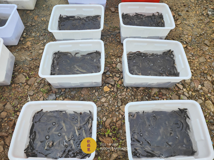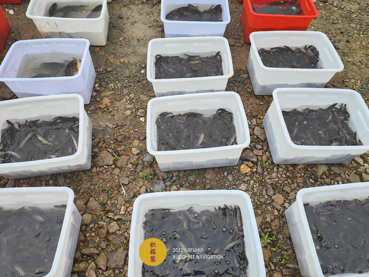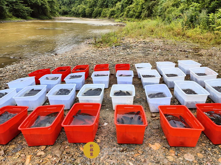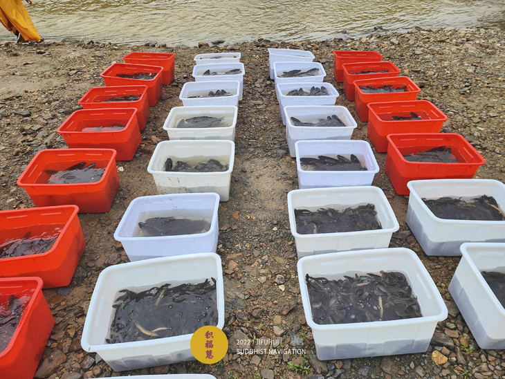 物命被整齐摆放在河边。值此药王菩萨圣诞日,能被获救,当具福德善根因缘。