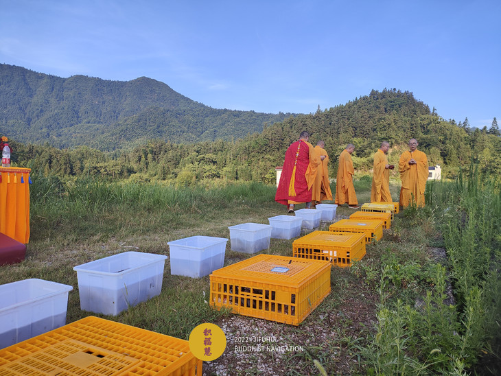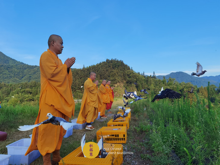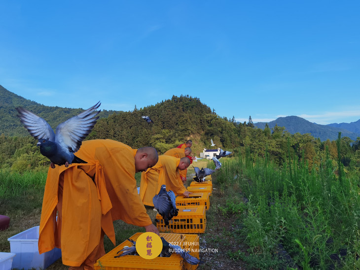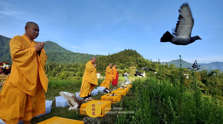 放生物命:既有鸽子等禽类,也有鲫鱼等水族众生。