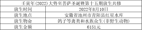 愿以此壬寅年大势至菩萨圣诞暨第十五期放生功德回向众等事业有成,佛光永照,化煞化凶,吉祥如意,增长诸福慧,消除宿现业,普愿离忧患,安乐常吉祥,悉发菩提心,同生极乐国。