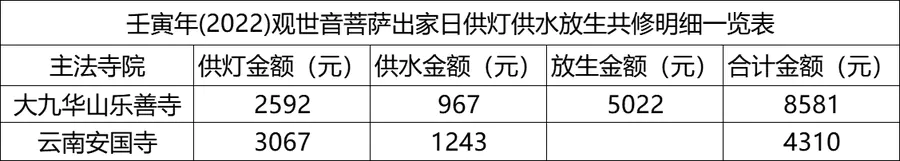 壬寅年观世音菩萨出家日供灯供水放生共修自2022年9月14日始,至2022年10月14日24时止,共计31天,同修随喜供灯款5659元、供水款2210元、放生款5022元。