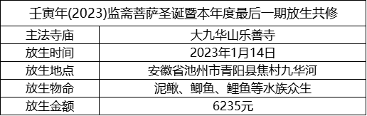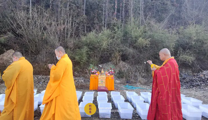以此壬寅年监斋菩萨圣诞暨本年度最后一期放生共修功德回向亲自放生者、出资放生者、乃至一念随喜者,祈愿众等在新的一年,工作顺利、财源广进,衣食丰足,家宅平安、运程顺遂、受用无缺。祈愿风调雨顺、五谷丰登、灾害无侵、国泰民安!
