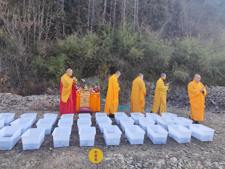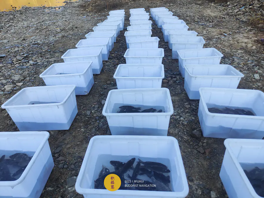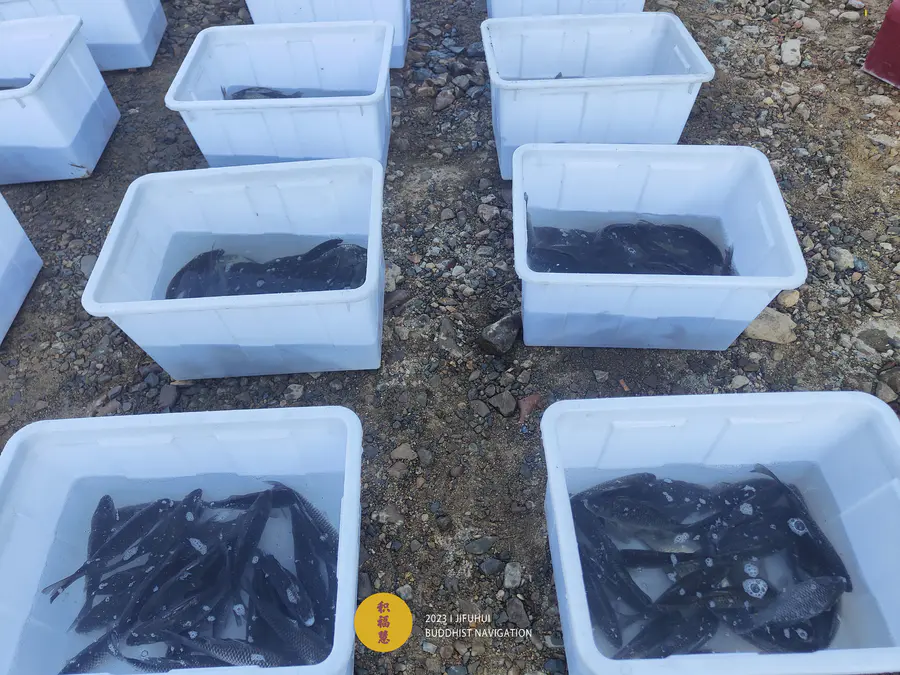 放生物整齐摆放在九华河边