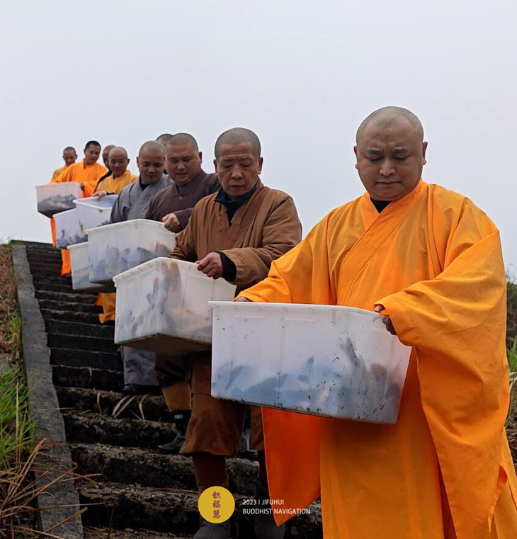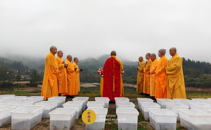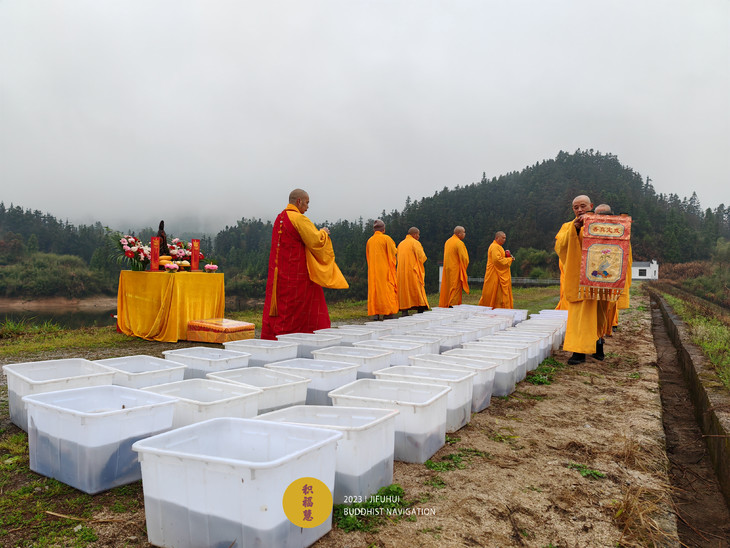 仪轨圆满。众法师合力将物命搬运到水边,陆续放入水库中。