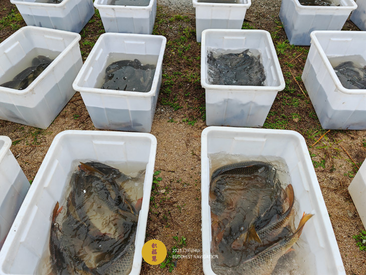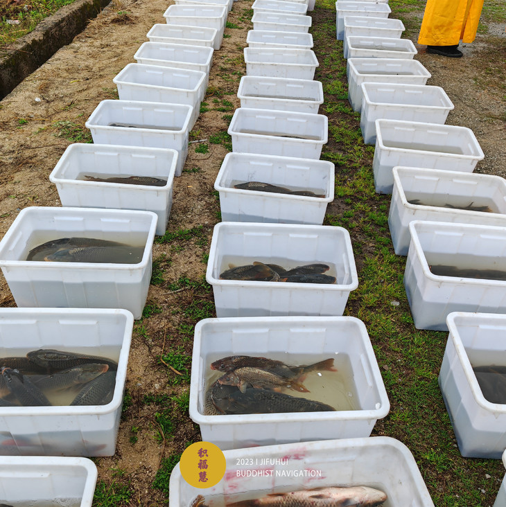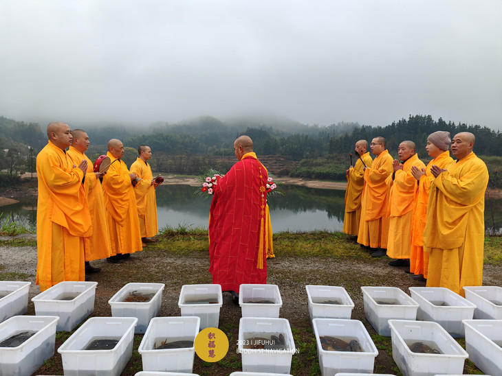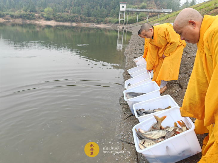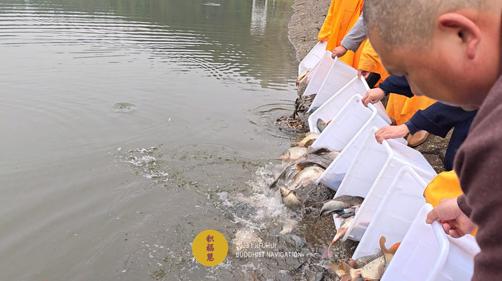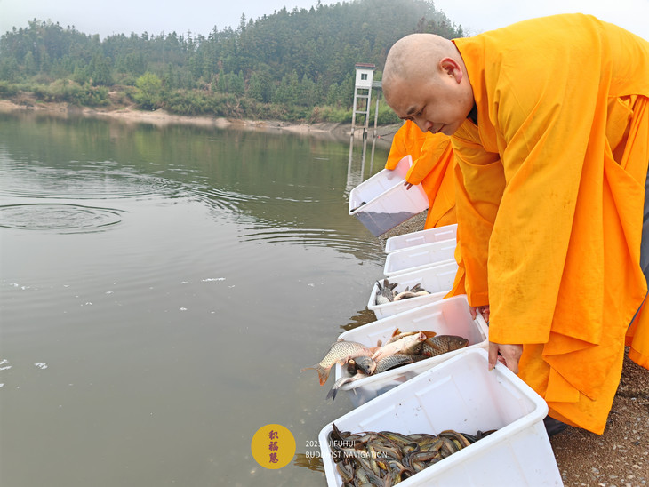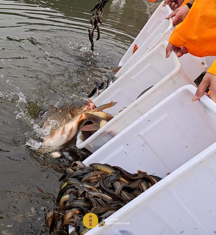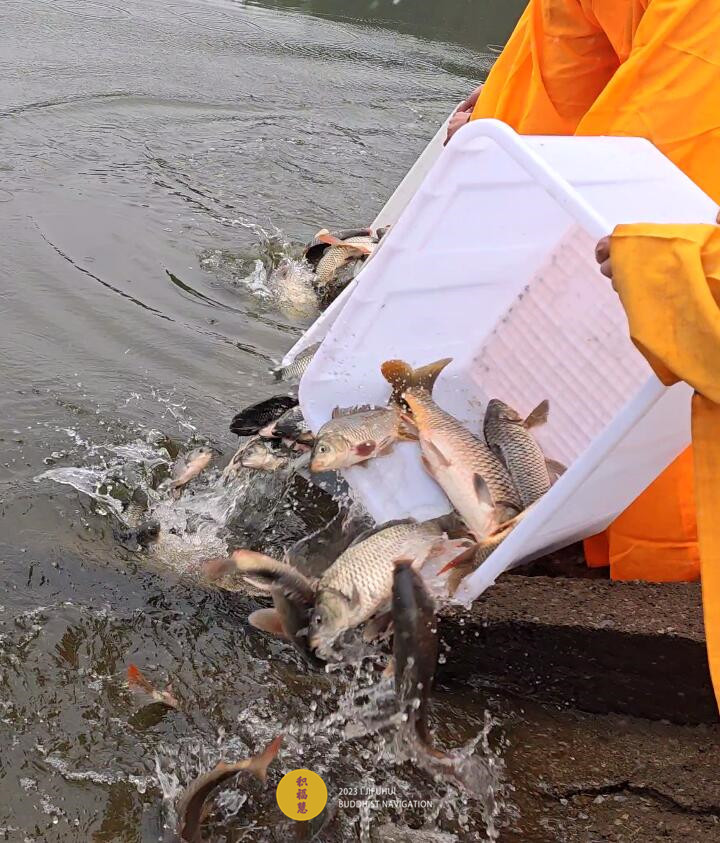 2023年3月21日,癸卯年二月三十,九华山道场诸位法师在安徽省池州市青阳县晚口水库解救泥鳅、鲫鱼、鲤鱼等水族众生(非野生动物)金额合计5339元。