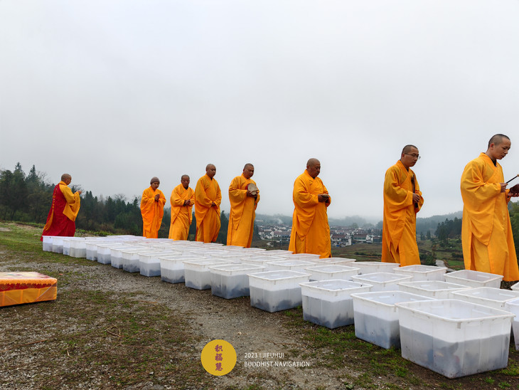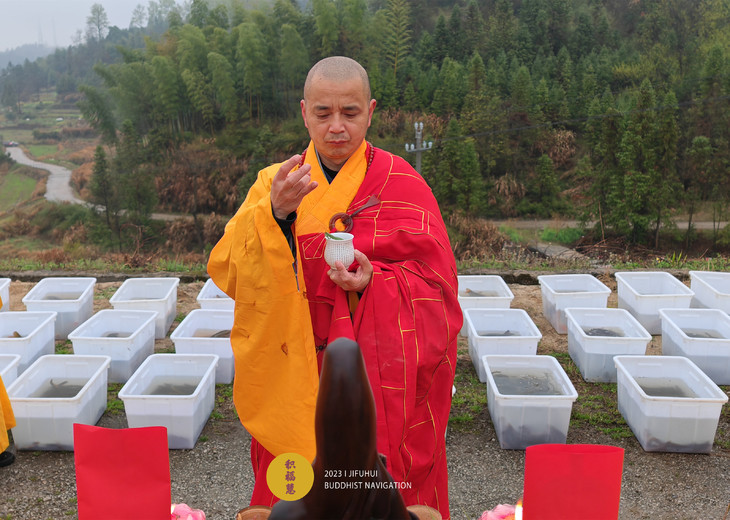 主法法师以大悲净水,为水族生灵净洒甘露,说法加持。