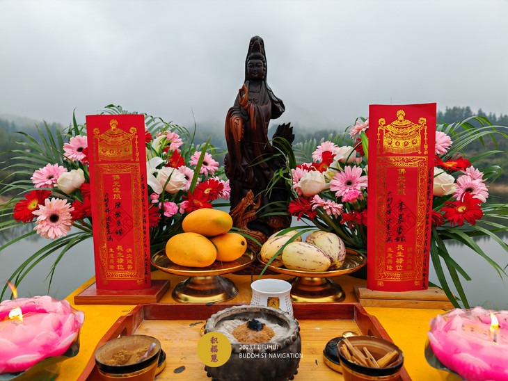 水库边设香案,备净水杨枝。一心奉请观世音菩萨慈悲加持。