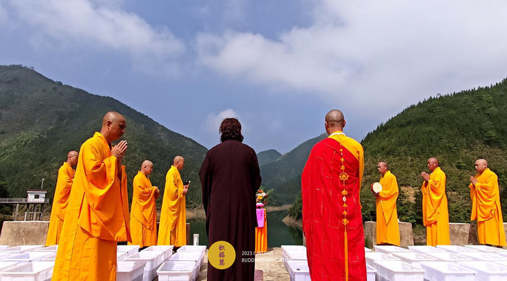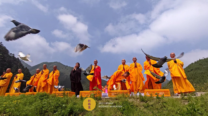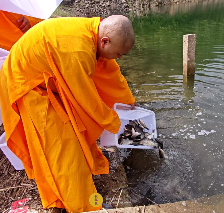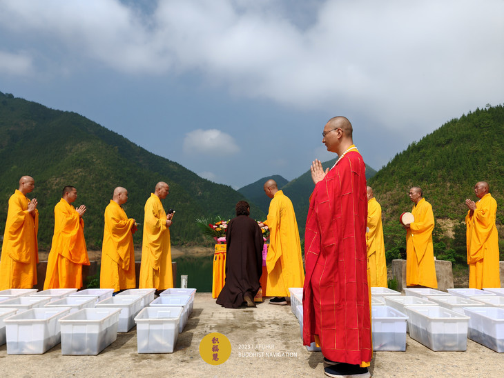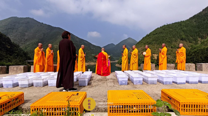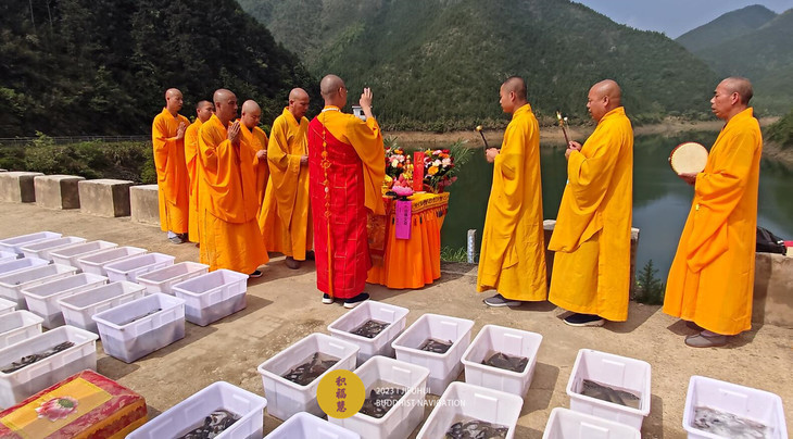 2023年4月20日,癸卯年三月初一,九华山道场诸位法师在安徽省池州市青阳县晚口水库护生鸽子、泥鳅、鲫鱼、鲤鱼等水族众生(非野生动物)金额合计5713元。