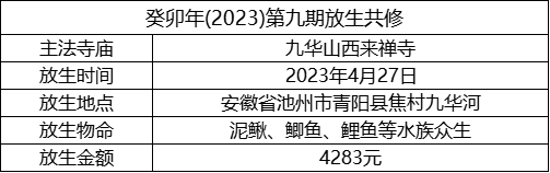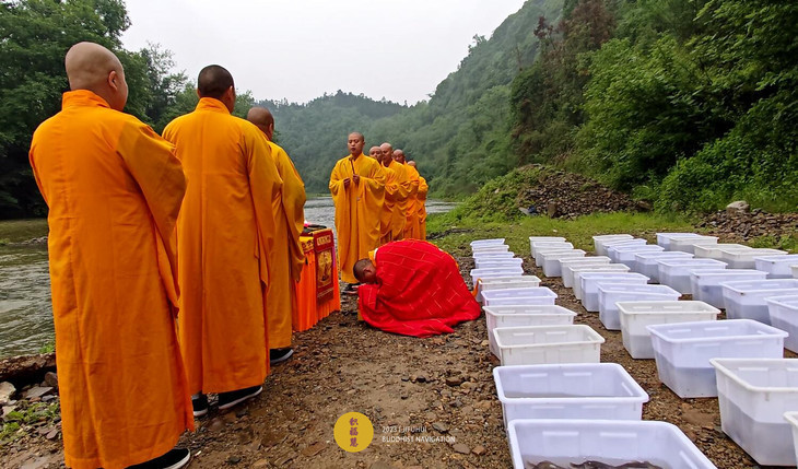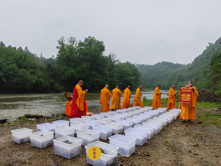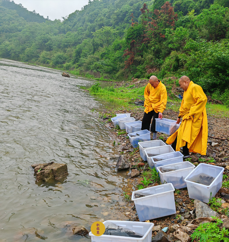 2023年4月27日,癸卯年三月初八,九华山西来禅寺诸位法师在安徽省池州市青阳县焦村九华河解救泥鳅、鲫鱼、鲤鱼等水族众生(非野生动物)金额合计4283元。