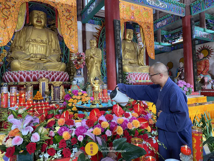 《灌洗佛形像经》载:“诸善男子善女人,于佛灭后当至心念佛无量功德之力,浴佛形像如佛在时,得福无量,不可称数。” 释迦牟尼世尊示生世间,说法度生,世间遂有三宝,众生幸得依怙。佛诞之日,我们灌沐太子像,行持善法,忆念三宝重恩,藉由浴佛的功德,洗涤自身的烦恼尘垢,净化依报的世界国土。