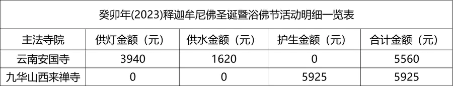 积福慧癸卯年释迦牟尼佛圣诞暨浴佛节活动自2023年4月26日启建,至2023年5月26日23时停止接收功德款,共计31天。同修随喜供灯款3940元,供水款1620元,护生款5925元。