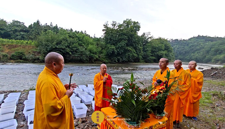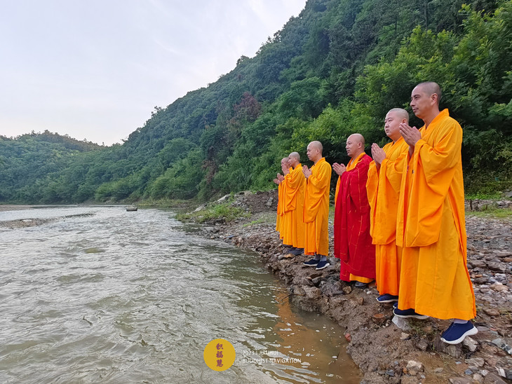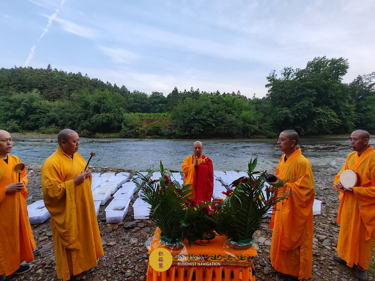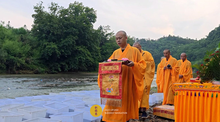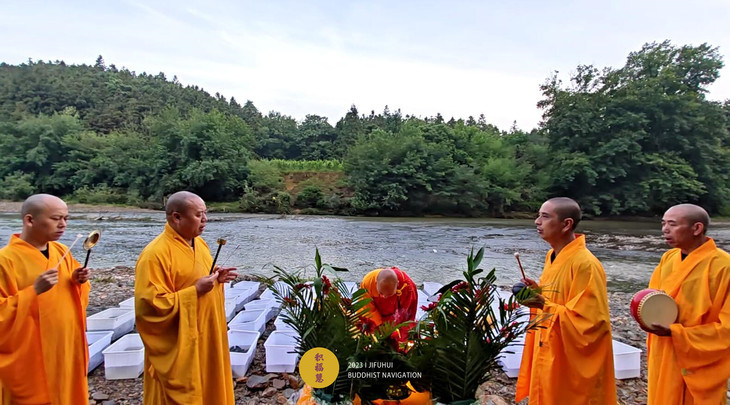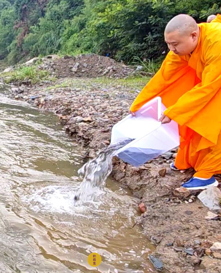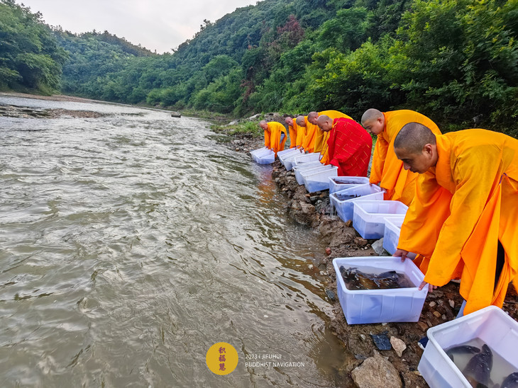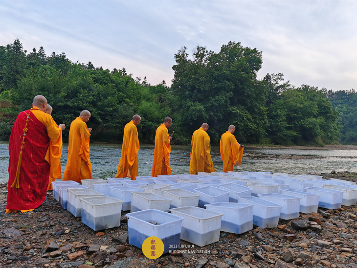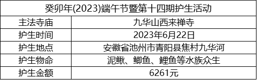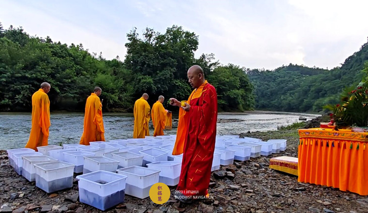 2023年6月22日,癸卯年五月初五端午节,九华山道场诸位法师在安徽省池州市青阳县焦村九华河解救泥鳅、鲫鱼、鲤鱼等水族众生(非野生动物)金额合计6261元。