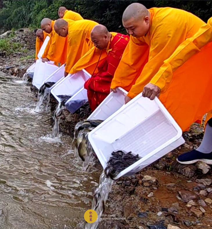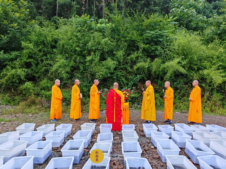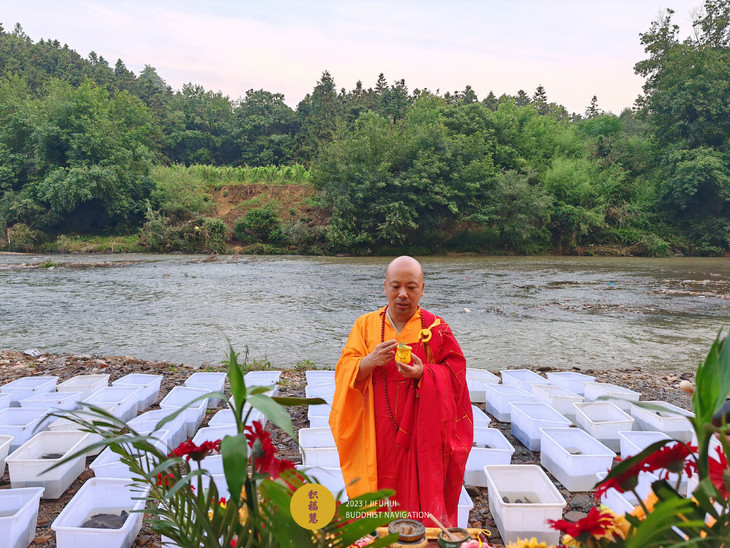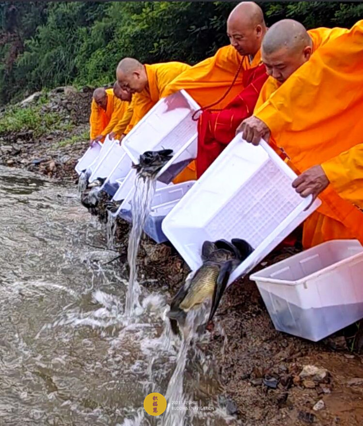 法师为被放物命授三皈依,开示十二因缘生灭之法。诵往生咒等,通过咒力加持,令诸众生仰仗佛力,永不堕恶趣,转生善道。