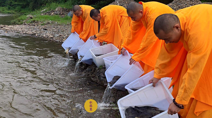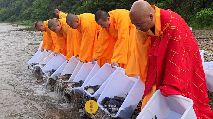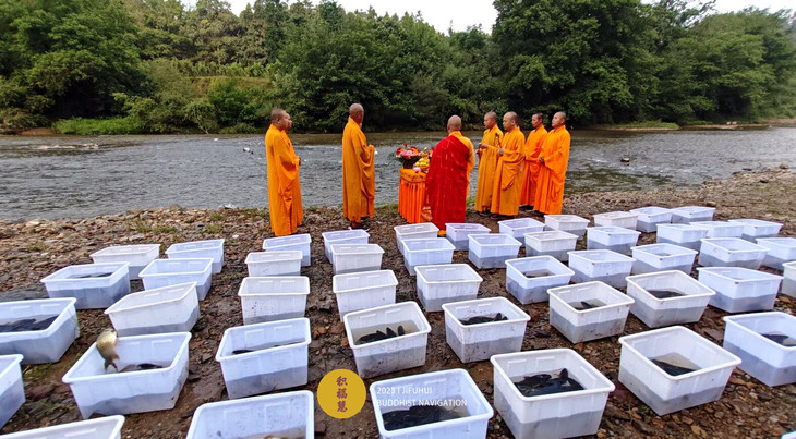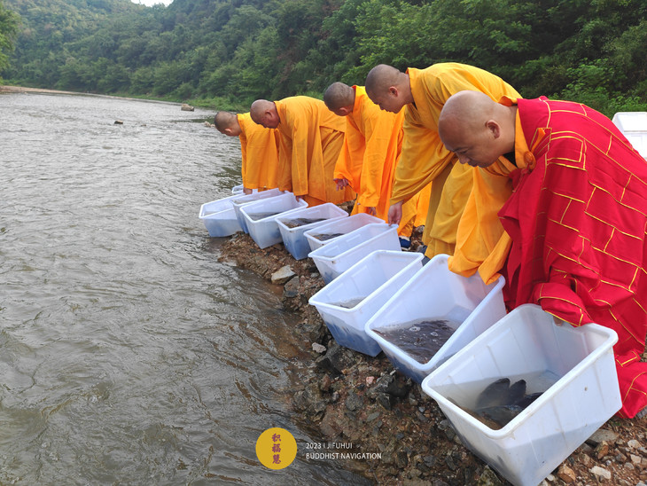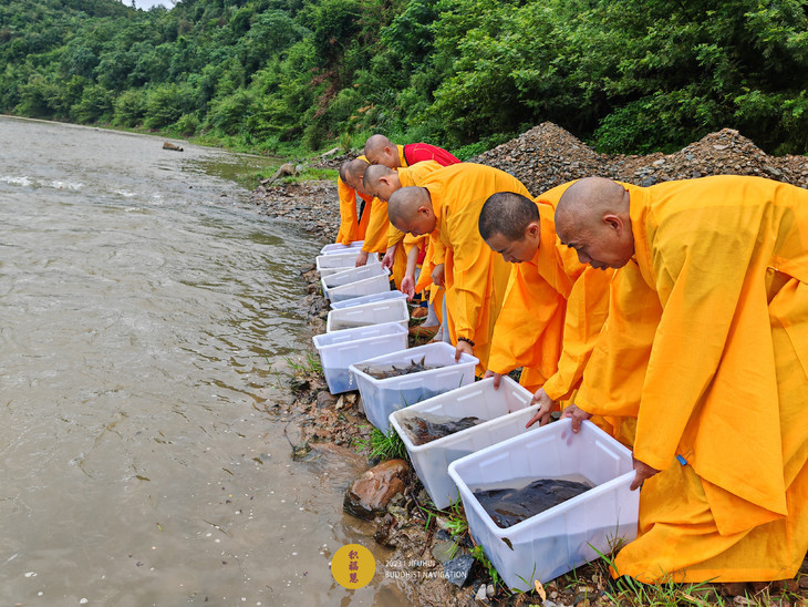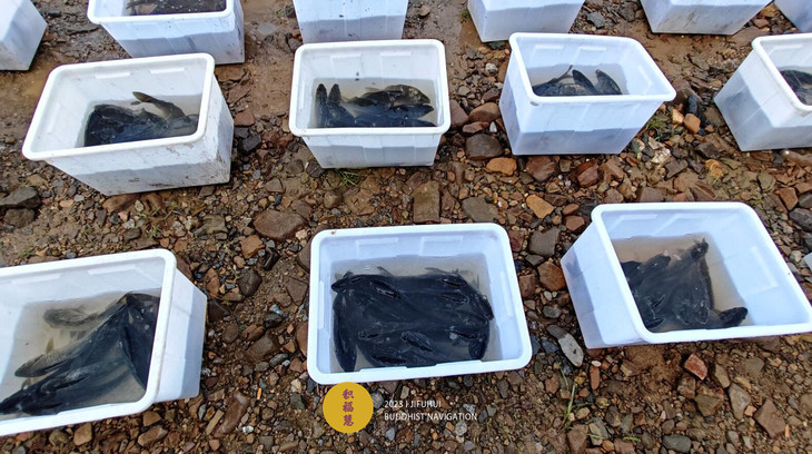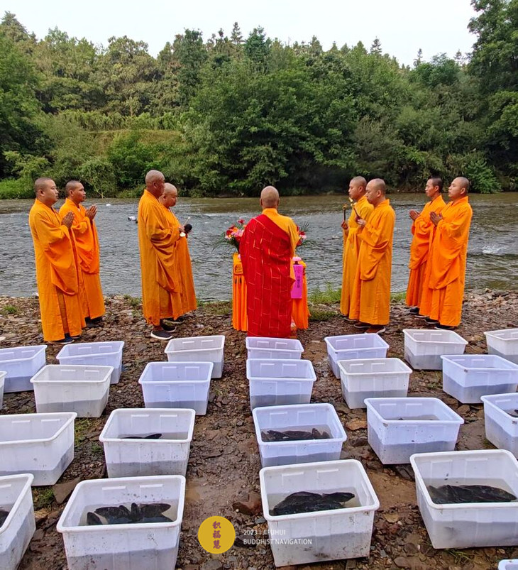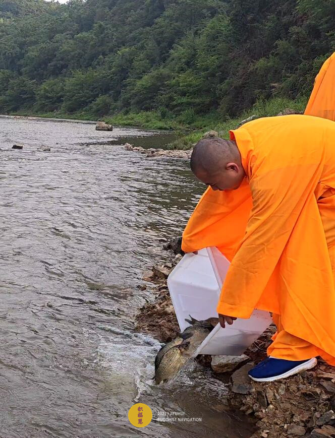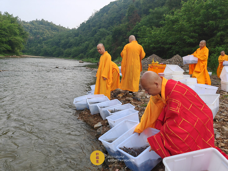 2023年8月16日,癸卯年七月初一,九华山道场诸位法师在安徽省池州市青阳县焦村九华河解救泥鳅、鲫鱼、鲤鱼等水族众生(非野生动物)金额合计4149元。